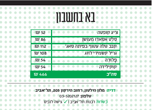 הקינוח הנוסף שדגמנו היה קוקילידה, שלא הייתה רעה, אין פה מנה שאפשר לקרוא לה כך, אך בהחלט סבלה מביצוע פרווה, תרתי משמע. ואולי צריך להניח לגלידה הנוסטלגית משנות התשעים, שכמו רבים מחבריה למחזור אינה עומדת במבחן הזמן. פה ניסו אינטרפרטציה שכוללת שתי עוגיות מָחְלֵבּ ויָאנְסוּן (קמח דובדבן ושומר) וביניהן גלידת ארל גריי. אל מול כל הפלא שקדם לה היא זרחה בבינוניותה, ואולי גם המחישה עד כמה לא פשוט לזכות במדליית זהב כשבוחנים קרב־רב של תפריט שלם.