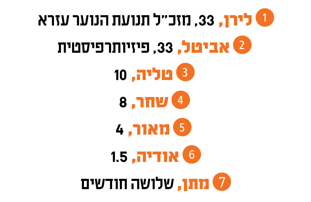 הילדים // טליה, הבכורה, חניכה בקבוצת נירים בעזרא, אוהבת חיות ומובילה קמפיין משפחתי נלהב להביא כלב הביתה. שחר, אחותה הקטנה, חריפה וחדת מחשבה. "בזמן ההיריון איתה הייתי כל הזמן עם חשק לחריף, וזה בדיוק מה שיצא". מאור שובבה עם צחוק מדבק, ומביאה אור לכל מקום שהיא נמצאת בו, ואודיה כבר יודעת לשיר יותר ממאה שירים, גם אם היא עדיין לא מבינה לגמרי את המילים. מתן הוא הבן הראשון אחרי ארבע בנות - גאווה גדולה של כולם.