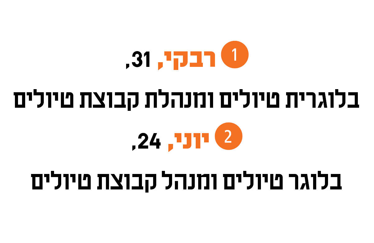 צעירים // ההכנסה העיקרית שלהם היא מקבוצת מטיילים לצעירים (בני 21 עד 35) דתיים – מכל הסקאלה: חרדים, חסידים, דתיים־לאומיים, כאלה שהתחזקו רק בשנה האחרונה. יש כבר זוג שהכיר בטיולים, והחתונה הייתה לפני כמה חודשים.