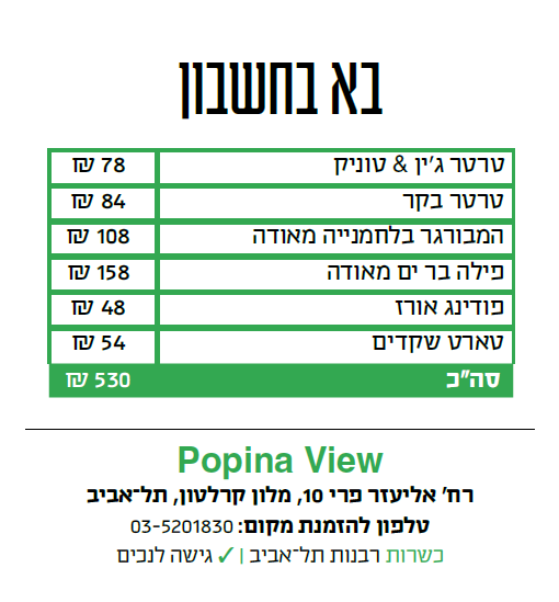 בניגוד למיזמי פופ־אפ קלאסיים של קינוחים או מיצים - להקים מסעדה לחודש בלבד זה עניין טריקי. אין זמן לחסדי הרצה, חייבים לעמוד בסטנדרטים הגבוהים מהיום הראשון. מצד שני, הזמן הקצוב מייצר באזז, נוטע בסועדים תחושת דחיפות ומתפעל היטב את בלוטות ה־FOMO, תמריץ מבריק (והכרחי) בזמנים שאנשים ממעטים בהם לצאת מהבית. הפופ־אפ צפוי כרגע לפעול עד ל־17 בספטמבר, אך הימור שלנו: הניסוי יצליח ו"פופינה ויו" תאריך ימים מעבר לכך. שהרי כל סוף הוא תמיד התחלה של משהו אחר.