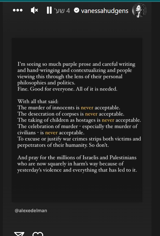 הכוכבות של סדרת הסרטים האהובה בכל הזמנים, ובמיוחד על ילדי ישראל, אשלי טיסדייל וונסה הדג'נס, פרסמו שתיהן סטוריז מתואם ברשת האינסטגרם שהביע תמיכה מוחלטת בישראל וסלידה עמוקה ממעשי המחבלים.