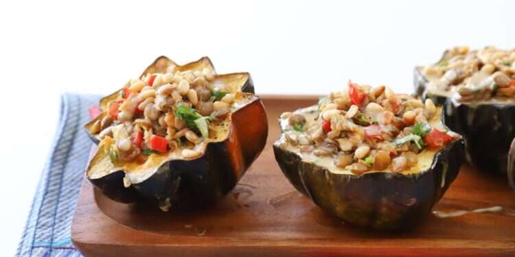 - ממלאים כל חצי דלעת בנדיבות (אפשר לדחוס קצת עם כף) ומקשטים עם הצנוברים.