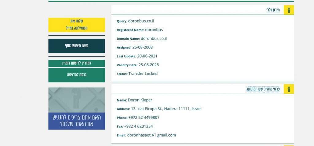 כפי שאנו רואים רשום שבעל האתר הוא דורון קלפר , ואנו רואים גם את הטלפון הנייד שלו. חיפוש בגוגל של השם דורון קלפר , וחיפוש בגוגל או באפליקציית me , את מספר הנייד שלו , אישרו שאכן מאחורי אתר זה אכן עומד אדם מתחום ההסעות.