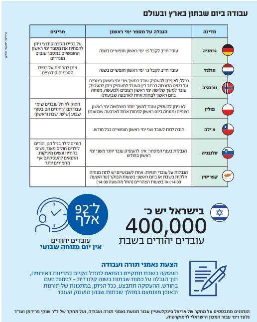 אריאל פינקלשטיין, דוקטורנט במחלקה למדעי המדינה באוניברסיטת בר־אילן, ערך עבור נאמני תורה ועבודה סקירה של המגבלות על העסקת עובדים בימי המנוחה ברחבי העולם (ראו טבלה). "יש שני סוגים של חקיקה, גם בישראל וגם בעולם, ביחס להגבלות על עבודה ביום המנוחה", מסביר פינקלשטיין, "סוג אחד מטיל הגבלות על פעילות בתי עסק ביום המנוחה הרשמי, שבמרבית מדינות המערב הוא יום ראשון. בישראל, למשל, ישנם חוקי העזר של הרשויות המקומיות, וכל אחד קובע האם מותר או אסור לפתוח בשבת מסעדות, בתי קולנוע וכן הלאה. סוג אחר של חוקים מתייחס להעסקת העובדים, ודן בשאלה כמה מנוחה צריך לתת לעובדים. החוק יכול להתייחס לכך שצריך לתת יום מנוחה, לאו דווקא ביום קבוע".