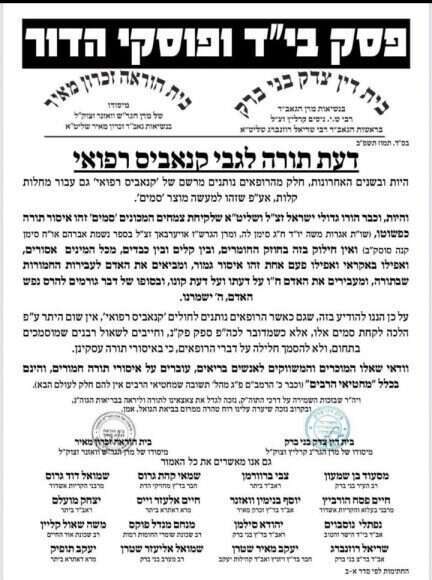 צריכת חומרים פסיכואקטיביים כקנאביס ודומיו נחשבה לאורך השנים בציבור החרדי כנושא שאיננו קשור אליו בשום צורה. "סמים" זוהו בעולם החרדי כאחת מבעיותיו של הרחוב החילוני הקלוקל, שהמגזר רחוק ממנה בתכלית. אך בחודש האחרון נפל דבר. בצעד חסר תקדים פרסמו שני בתי הדין המרכזיים של בני־ברק, ואליהם הצטרפו רבנים ודיינים בולטים מריכוזים חרדיים אחרים, פסק דין פומבי האוסר על שיווק קנאביס רפואי וצריכתו. פסק הדין, שנתלה ברחובות והופץ בבתי הכנסת, שובר את השתיקה בנושא וקורא לילד בשמו מבלי להתחבא מאחורי ניסוחים מעורפלים. "לקיחת צמחים המכונים 'סמים' זהו איסור תורה כפשוטו", כותבים הרבנים. "ואין חילוק בזה בחוזק החומרים, ובין קלים ובין כבדים, מכל המינים אסורים, ואפילו באקראי ואפילו פעם אחת אסור באיסור גמור, ומביא את האדם לעבירות החמורות שבתורה".
