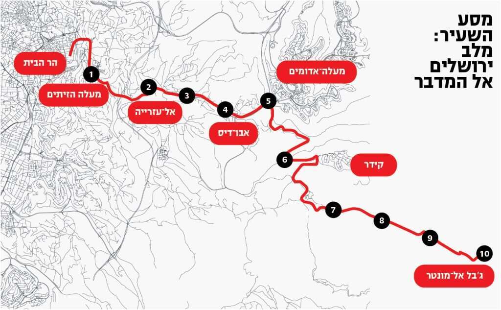 מהשכונה היהודית יש לרדת מזרחה דרך ואדי קדום (הסוכה השנייה) לכפר אל־עזרייה, בכביש הישן שדרכו נסעו פעם – בטרם הקמת גדר ההפרדה – אל מעלה־אדומים ואל יריחו. בין הסוכה השנייה לשלישית עוברת כיום גדר ההפרדה ואיננה מאפשרת עוד לרדת לים המלח בדרך יריחו, וגם לא לרדת לצוק העזאזל מירושלים. נדאג אם כן לפרצה בגדר מבעוד מועד, ונמשיך במסע אל הסוכות השלישית והרביעית שעל אם הדרך למעלה־אדומים. סוכה חמישית נמקם בפנייה ליישוב קידר, סמוך לכניסה למעלה־אדומים, וסוכה שישית בכניסה לקידר. סוכה שביעית תמוקם ממזרח לקידר דרום, על השביל המתחתר לפסגת הר מונטר, צוק העזאזל. שמינית תוצב בכפר הזעיר אל־מונטר, והתשיעית והעשירית יעמדו בהמשך שביל העפר המוביל להר.