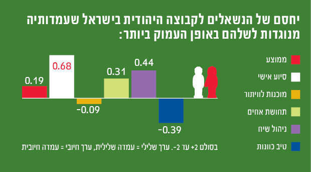 התרשים השלישי מציג זווית מבט נוספת על השינויים שהתחוללו בחברה הישראלית בחצי השנה האחרונה. בחלק זה של המחקר נבדקו עמדותיו של המשיב כלפי הקבוצה היהודית בישראל שעמדותיה מנוגדות באופן העמוק ביותר לעמדותיו. סולם התשובות נע בין עמדה שלילית ביותר (1-) ועד עמדה חיובית ביותר (1+). הנתונים מלמדים כי בשלושה מתוך חמשת הנושאים שנבדקו העמדות חיוביות במידת־מה, אך בשני נושאים העמדות שליליות, ובסך הכול העמדה חיובית אך לא רחוקה באופן משמעותי מהקו "הניטרלי" (0.0).