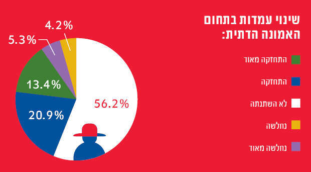 התרשים השני מציג מגמה דומה, אם כי לא זהה, בתחום האמוני. מרבית המשיבים לא שינו את עמדתם האמונית, אך מקרב 43.8% אשר דיווחו על תזוזה כלשהי, 34.3% דיווחו על תזוזה לכיוון האמוני, בעוד רק 9.5% דיווחו על תזוזה לכיוון פיחות באמונה. הקבוצות שדיווחו על עלייה בהיבט האמוני היו קבוצות האמצע, בעוד קבוצות השוליים דיווחו על עלייה מתונה יותר או על ירידה.