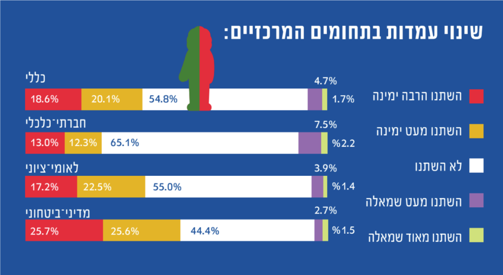 התרשים הראשון המוצג כאן מלמד כי בכל אחד משלושת התחומים, וגם באופן כללי, שיעור גבוה יותר של ישראלים לא שינו את דעותיהם, אך מקרב המשיבים שכן שינו את דעותיהם, אחוז גבוה יחסית שינה את דעותיו בעקבות המלחמה לכיוון ימני־שמרני, ואילו לכיוון עמדות המאפיינות שמאל־ליברלי ישנה תזוזה זניחה. עוד עולה כי בתחום המדיני־ביטחוני השינוי גדול יחסית, בעוד שבתחום הכלכלי־חברתי השינוי הרבה פחות משמעותי.