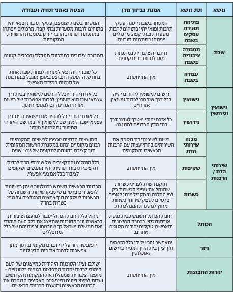 הנה תזכורת קצרה לנושאים המרכזיים באמנה הזו. בתחום נישואין וגירושין, למשל, סבורים מחברי האמנה כי גבר ואישה יוכלו להינשא בכל דרך, אם בנישואין אזרחיים ואם בכל זרם יהודי־דתי אחר. ואולם, הכרה ביהודי רווק תהיה רק על פי בית הדין של הרבנות הראשית, וכן גירושין יבוצעו רק בדרך אורתודוקסית. לזוגות חד־מיניים לא תתאפשר הסדרת זוגיות. בנושא הגיור קובעת האמנה כי המדינה תגדיר כיהודי כל מי שעבר הליך גיור על ידי כל אחד מזרמי היהדות, כאשר במרשם האוכלוסין ייכתב מי ערך את הגיור.