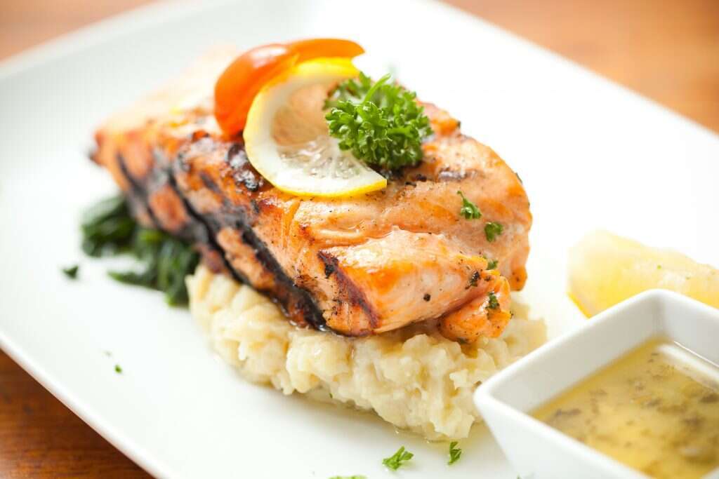 סלמון צלוי לצד קרם שורשים לבן וקראסט עשבי תיבול של תום פרנץ