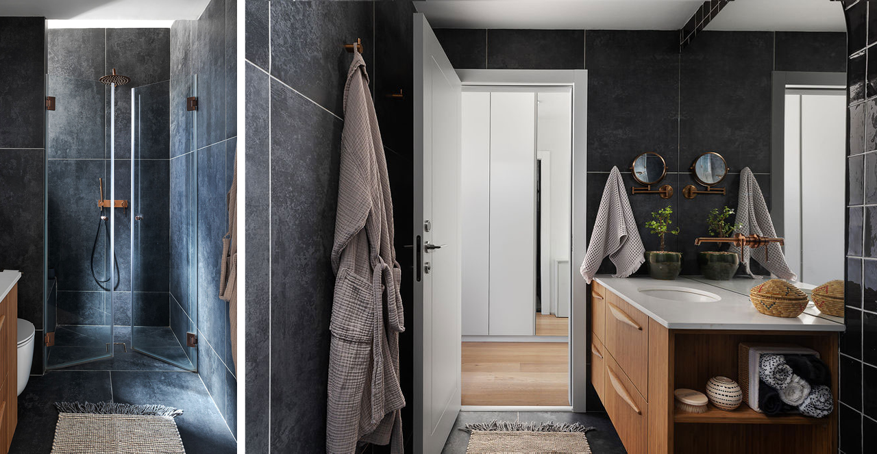 אלמנט נגרות דרמטי מחלק את הקומה באופן ורסטילי וממקסם את שטח האחסון מתחת למדרגות. מאחורי דלת נסתרת, חדר משפחה אינטימי משמש גם יחידת אירוח מפנקת העומדת בפני עצמה. פתיחתה ביום יום יוצרת אזור משני ופרטי יותר בפאתי החלל הציבורי. חדר הרחצה בה שואב השראה מהעיצוב בספריה הלאומית החדשה בירושלים, בצבעוניות כחולה עמוקה, חומריות מסורתית אך עכשווית ומוטיב קשתות שחוזר ברחבי הבית.