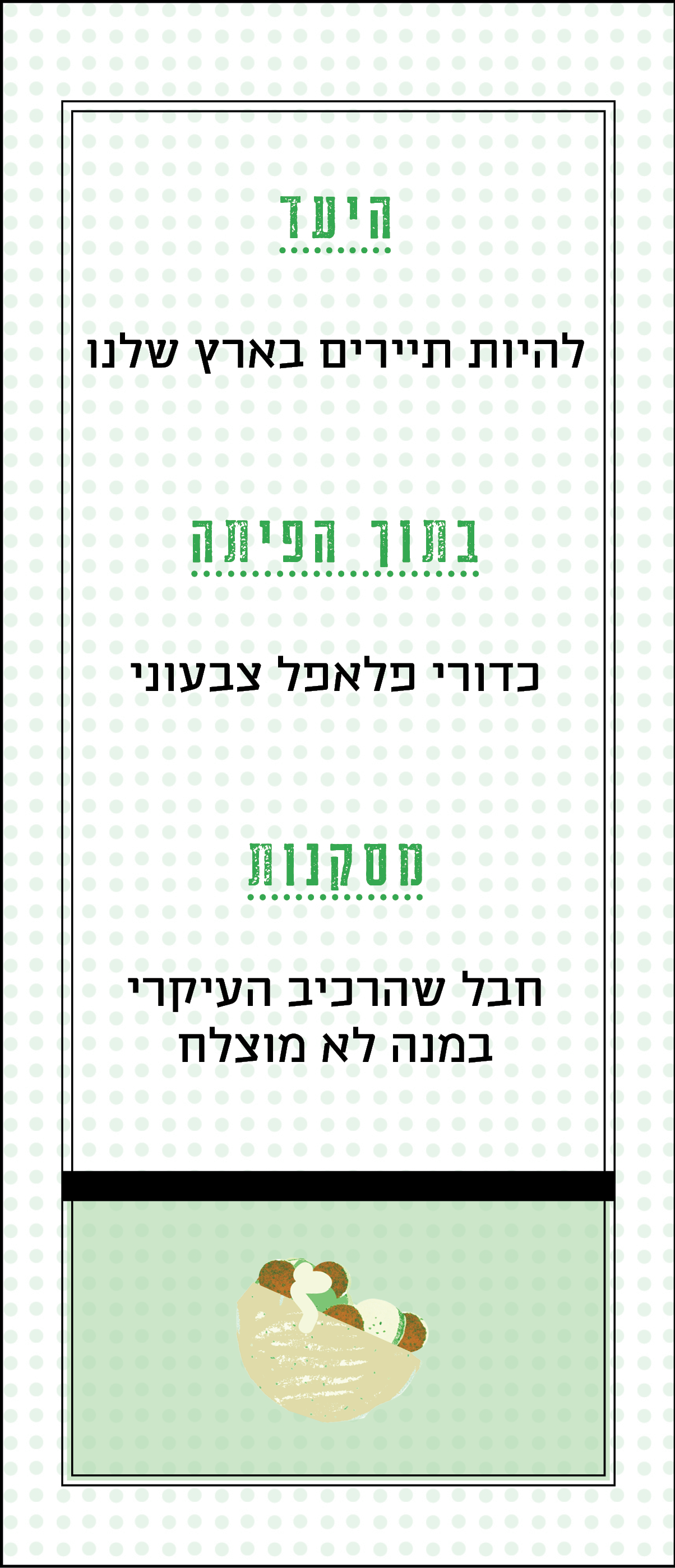 ביום שישי שמשי אחד טיילנו עם חבר ברחובות תל־אביב, והרגשנו ממש כמו תיירים. שתינו קפה פה, סיירנו בגלריה שם, ואז באמצע אבן גבירול ראינו תור. אז נעמדנו אחר כבוד מאחורי האדם האחרון והצצנו מהצד כדי לראות מה מחכה בקצה. התור היה איטי, התקדם לאט, מוזיקת טראנס וריחות של טיגון ריחפו מעלינו. מצד שמאל שלנו קולות הרחוב הסואן אבל זה לא הפר את שלוותנו, אם יש תור כזה - אין מה לדאוג, ההנאה מובטחת. בדשדוש איטי קדימה התחילה להיחשף לעינינו שורת סלטים יפים, ובסוף השורה קערה ענקית של פלאפלים צבעוניים. היו שם כדורים אדומים, ירוקים, צהובים ואפילו צהובים עם נקודות.