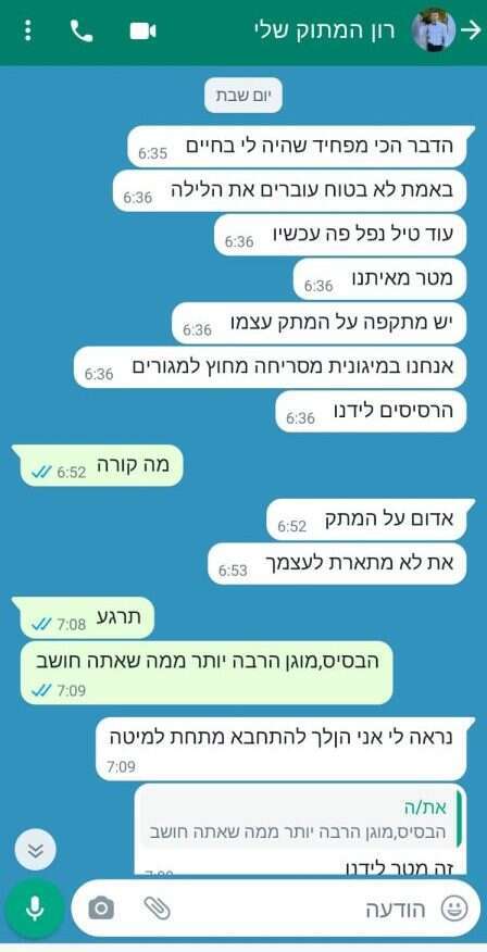 "ביום שבת המדובר התחלתי לקבל ממנו הודעות ווטסאפ בשש וחצי בבוקר. זה היה זמן קצר אחרי שהם החליפו משמרת, וכשהחלו לירות טילים הוא רץ על אזרחי למיגונית בבסיס, כשהוא לבוש רק בגופיה ונועל כפכפים. הוא כתב שהפעם הרעש נשמע הרבה יותר חזק מהרגיל, מה שהתברר מאוחר יותר כפיצוץ של גדר הבסיס", היא משחזרת.