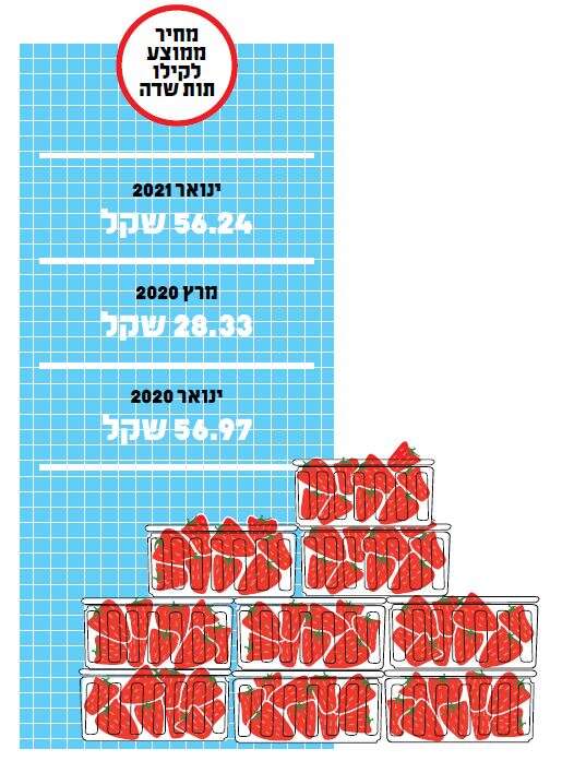 "לראיה, מחירו הממוצע של קילו תותים לצרכן בינואר השנה (2021) היה 56.24 שקלים, וגם בינואר 2020 היה המחיר דומה ועמד על 56.97 שקלים. ככל שהעונה מתקדמת, המחיר יורד. במרץ 2020 נמכרו התותים תמורת 28.33 שקלים בממוצע לקילו, ומחיר דומה צפוי בחודש מרץ 2021.