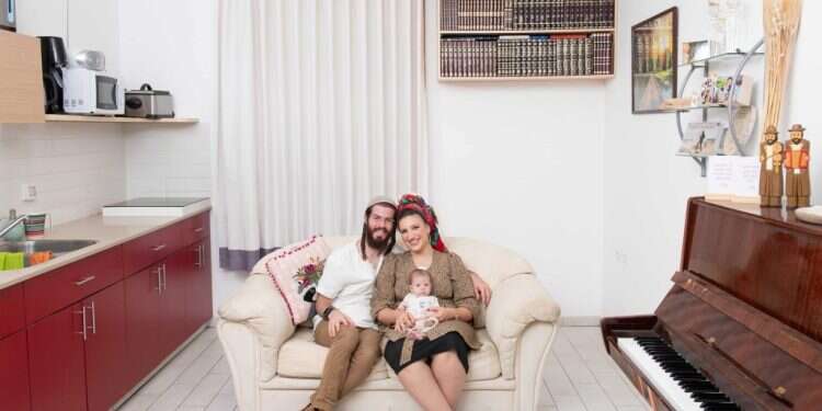 סלון // במרכז הסלון עומד פסנתר שאוריאל הביא לשלו בהפתעה יומיים אחרי שנכנסו לדירה, ועליו ניצבים פסלי ארבעה נגנים חסידיים מגולפים בעץ, מעשה ידי דודו של אוריאל, ניצול שואה. לידו עמדת נרות השבת עם תמונות המשפחה ומזכרות של אוריאל מהצבא, ועל הקיר תלוי פאזל 1,000 חלקים שהם הרכיבו באחד מסופי השבוע הארוכים בחורף. ספריית הקודש הרחבה מלאה ספרים.