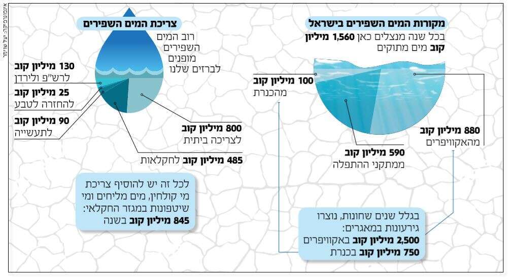 צריכת המים הכוללת של מדינת ישראל עומדת כיום על כ־2 מיליארדי קוב בשנה. רבע מזה, כחצי מיליארד קוב, מגיע ממי קולחין, שכבר היו בשימוש ראשוני ועוברים טיהור. השאר, כ־1.5 מיליארדי קוב, הם מים שפירים, כלומר ראויים לשימוש. כ־750 מיליון קוב מתוך הכמות הזו הולכים לשימוש ביתי (שתייה, גינון, ניקיון ועוד), כ־500 מיליון לחקלאות, כ־100 מיליון לתעשייה וכ־150 מיליון מועברים לרשות הפלסטינית ולירדן לפי הסכמים בינלאומיים.