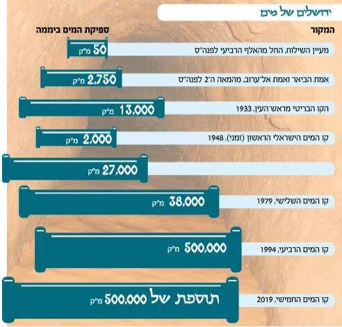 עד לפני שנים אחדות התבססה אספקת המים של ירושלים על המוביל הארצי, כלומר בעיקר על מי הכנרת ועל מי תהום שנשאבו מקידוחים. כיום עובר המוקד אט־אט אל חמשת מפעלי ההתפלה הפזורים לאורך חוף הים התיכון. בשנה הבאה עתיד להיחנך קו חדש לבירה, חמישי מאז הקמת המדינה, שיחד עם הקו הרביעי יזרים לעיר מיליון מטרים מעוקבים ביממה - הכמות שמפעל האמות הקדום סיפק בשנה תמימה. המיזם הזה צפוי לתת מענה מלא לירושלים ולסביבותיה, כולל לשטחי הרשות הפלסטינית, עד לשנת 2065. ממש כמו קו המים שהונח במהלך מלחמת השחרור, גם הקו החמישי יצא לדרך מחולדה, שם יהיה מחובר למערכת המים הארצית. המים יזרמו עד לצומת אשתאול והלאה למוצא, הנקודה שבה יתחבר הצינור למערכת המים הירושלמית העירונית.