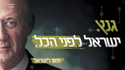8. המשכיות. כן, רק עין אחת יש פה, ודי בה כנראה כדי שהמצביעים הפוטנציאליים והפוטנציאליות יימסו אל מול מראהו וגובה קומתו של הרמטכ"ל לשעבר. אגב, אם תתבוננו היטב תראו שאין כאן חיתוך מדויק של חצי פנים: גנץ מטה את פניו אלינו, לימין, והחריץ במרכז הסנטר שלו לא נחתך בקצה אלא מופיע במלואו בתמונה. חצי פנים במודעה כזו - זו לכאורה בחירה גרפית מעניינת ושונה, אלא אם נזכרים שרק לפני חודש מסע פרסום אחר נקט באותו עיצוב: חצאי פנים של נתניהו, שקד ולפיד הוצגו לראווה ברחבי הארץ בשלטי חוצות בקמפיין "הגיע הזמן להתגרש מהפלסטינים" של, ניחשתם נכון, "מפקדים למען ביטחון ישראל".