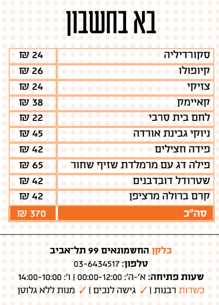 בערך פעמיים ביום אני מקבלת הודעות בסגנון "אנחנו חוגגים עשר שנות נישואין/ יומולדת חמישים/ מסיבת רווקות ומחפשים מסעדה שווה, לא משהו רגיל, כבר אכלנו בהמון מסעדות ואנחנו רוצים הפעם משהו מיוחד". ובכל פעם כזו, אני מוצאת את עצמי חסרת מילים, כי למרבה הצער, כמעט לא נפתחות מסעדות חדשות (אם סופרים רק את הכשרות) שבאמת מביאות איתן איזושהי בשורה. כולן יושבות על אותה המשבצת של קרפצ'יו־סשימי־חציל שרוף במנות הראשונות ונתח קצבים־אנטרקוט־פילה דג על מצע פירה כלשהו בעיקריות (או סלט אנדיב ופירות־סשימי־פוקאצ'ה־מטבלים וניוקי־ריזוטו־פיצה, אם מדובר במסעדה חלבית). אף אחד לא מרשה לעצמו לעוף יותר מדי רחוק, וההבדלים העיקריים בין המסעדות נטועים ברמות הדיוק ובשיטות ההכנה של כל מנה.