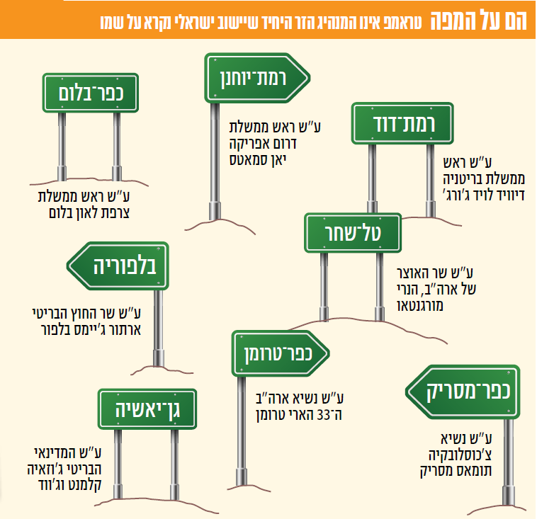 פרץ מציין כי בישראל יש כבר כמה יישובים הקרויים על שם מנהיגים זרים שתרמו לפיתוחה ולשגשוגה של המדינה. כזה הוא למשל כפר־טרומן, על שם הנשיא האמריקני שהיה הראשון להכיר במדינת ישראל עם הקמתה; המושב בלפוריה, על שמו של שר החוץ הבריטי ארתור ג'יימס בלפור; קיבוץ כפר־בלום, שנקרא על שם ראש ממשלת צרפת לאון בלום, ועוד.