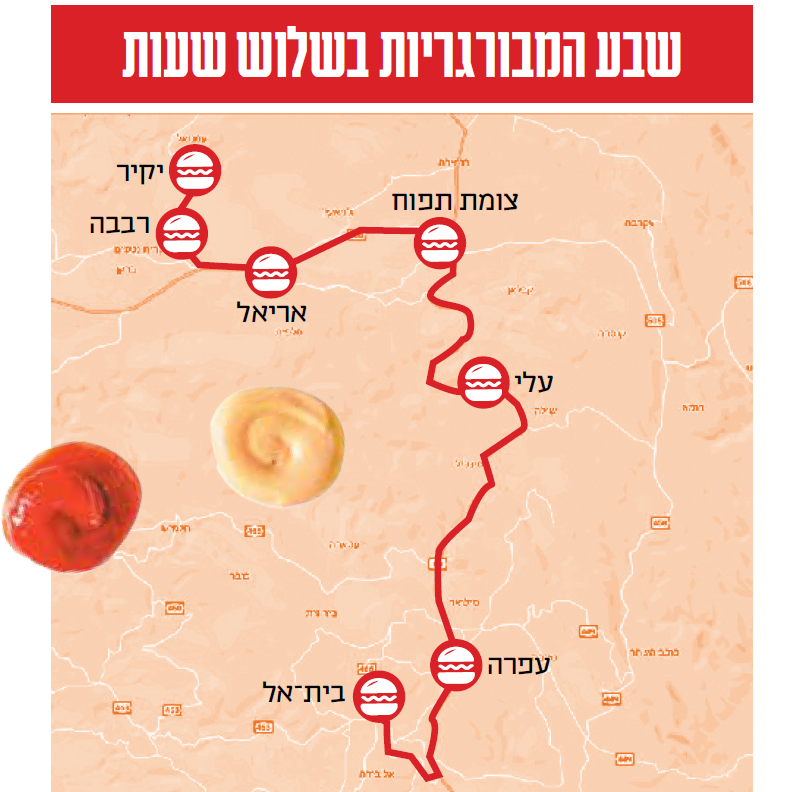 ממש על שער היישוב חיכתה לנו ההמבורגרייה עם השם שהכי נלקח משנות השמונים, "שלאגר". דידינו פנימה, ואיך שפתחנו את הדלת חיכה לנו החיוך הכי גדול שראיתי. "ידעתי שתבוא", אמר לי בחור עם הרבה שיניים, שלאחר שהמהמתי לכיוונו סיפר שקוראים לו דור. הוא גר בעפרה והשלאגר זה הבייבי שלו, שלוש שנים וחצי הוא כאן, נולד וגדל ביישוב. הוא שואל מה נרצה להזמין ואני עונה לו, אבל מתברר שאין חובש בתפריט. אני מנסה למשוך זמן ומנסה להתניע שיחה על המצב הביטחוני שתיתן לי רבע שעה עד לקציצה הבאה. יש לו חיוך כזה של אנשים שכבר ראו הכול, הוא מזהה אצלי מבט של אנשים שלא ראו כלום, אז הוא מספר לי שהוא עומד על ממוצע של פיגוע לשנה. אני שואל אותו אם לא מפחיד, והוא עונה לי שהדבר היחיד שמפחיד אותו זה לעבור את מידת הצלייה שהלקוח ביקש. אני שואל אם יוצא לו להאכיל גם פלסטינים, הוא אומר לי שמעט, ובעיקר את האלה עם החליפות והאישורים. אני אומר לו שאלה הכי גרועים, הוא אומר לי: "אתה תזמין מתישהו או שנמשיך לחפור פוליטיקה?"