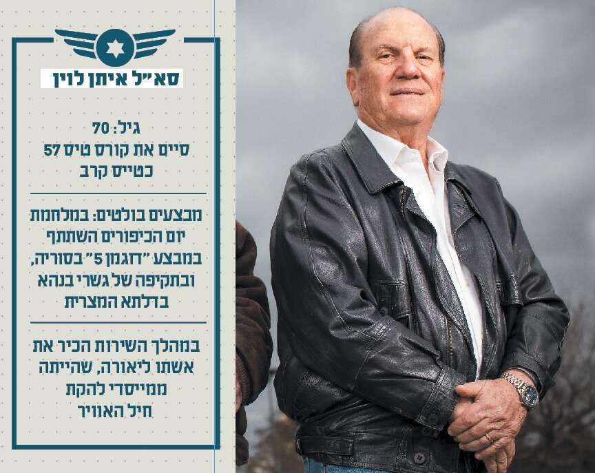 סא"ל בדימוס איתן לוין מעריך כי 20־25 אחוזים מבוגרי הקורס שלו, מספר 57, לא שרדו. "חלקם נפלו באימונים, רובם במבצעים", הוא אומר. "כל תקופת השירות בחיל האוויר הייתה סוערת, מלאה חוויות חיוביות - וגם שליליות". הוא בן 70, תושב רעננה, נשוי לליאורה, אב לשלושה וסב לשישה. בתו הגדולה, שרון, הייתה פקידת מודיעין בטייסת 105. במלחמת יום הכיפורים היה לוין בין מפציצי מרכז הקשר בבנהא, בדלתא המצרית. כמה ימים קודם לכן השתתף במבצע "דוגמן 5", שנועד לחסל סוללות נ"מ ברמת הגולן הסורית. "כשטסתי, לא רק ישבתי בתוך הגוף של המטוס, אלא ממש לבשתי אותו", נזכר לוין בחוויית הטיסה הקרבית בימים ההם. "הייתי חלק ממנו. הייתי כמו ציפור. אני הייתי המטוס".