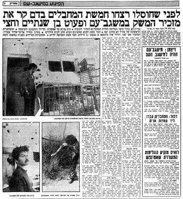 באותה שנייה נעות מיד קדימה ארבע חוליות: זיו קולברג רץ במהירות לעבר הדלת "שלו" שבצידו הדרומי של בית הילדים, בדיוק מול המדשאה הגדולה, שמעברה השני, כ־80 מטרים משם, עומדים וצופים כמו בסרט פעולה כל הגנרלים שהספיקו כבר להגיע לזירה וגם כמה חברי משק אכולי דאגה. הוא יורה לעבר שני החלונות שבהם נראה עד לפני כמה שניות המחבל שניהל את המשא ומתן עם כוחותינו. כשזיו חולף על פני החלון השני הוא מרגיש שנפצע בידו. הוא נצמד לקיר וצועק לחייליו לעקוף אותו ולהיכנס. כל האש שנורית על כוח זיו מגיעה מהחלון השני. מהדלת הפתוחה למחצה שלידו לא נורה ולו כדור אחד.