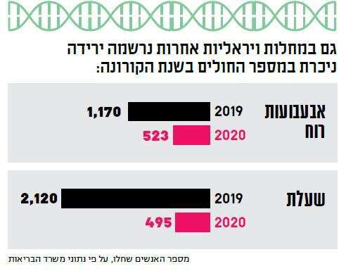 הנתונים הם דרמטיים, ומופיעים בשלל מחלות זיהומיות. מספר מקרי החצבת צנח מ־1,427 בשנת 2019 ל־11 בלבד בשנת 2020. את ההצלחה הזו מייחסים במערכת הבריאות לא רק להקפדה על היגיינה, אלא גם למבצע חיסונים נרחב שנערך אשתקד. מקרי הלישמניה, מחלה המועברת על ידי זבוב החול, פחתו מ־252 ל־91 בלבד. מחלת השיגלה, הנגרמת על ידי חיידק צואתי, רשמה בשנה החולפת 1,659 מקרים, לעומת 4,329 בשנת 2019. תואר הירידה החדה ביותר שייך לשפעת, מחלה נגיפית שתסמיניה הם חום גבוה, כאבי שרירים, כאבי ראש, שיעול, נזלת וחולשה כללית. כולנו זוכרים את תמונות החורף החוזרות ונשנות מבתי החולים, שמדווחים על מחלקות עמוסות ועל קשישים שנאלצים לשכב במסדרונות. והנה השנה – לא אותרו חולי שפעת בישראל.