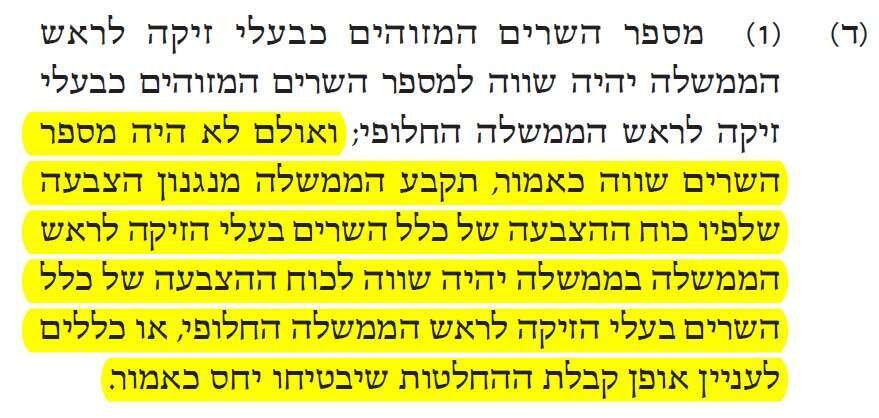 הסעיף הזה משליך גם על האפשרויות העומדות בפני בנט ולפיד, למשל, להרכיב ממשלת אחדות. מיסודו נועד החוק למצב שקיימים בו שני גושים גדולים, וכל אחד מה"ראשים" יודע מיהם שותפיו הטבעיים לגוש. כיום, לעומת זאת, לימינה יש 7 מנדטים בלבד, וגם יש עתיד היא מפלגה בינונית־פלוס, כשלרשותה 17 מנדטים. אם ייעשה שימוש בחוק ממשלת החילופים, ובנט ולפיד ימונו לראשי ממשלה, תעלה השאלה כיצד מחלקים את הסיעות האחרות השותפות בקואליציה: מי מהן מקיימת זיקה לראש א', ומי לראש ב'. בלי קביעת הזיקה, לא יוכלו מרכיבי הממשלה למנות מספר שווה של שרים מכל גוש, כפי שדורש החוק. גם אם תיעשה חלוקה מלאכותית כזו, קשה להאמין שבנט או לפיד יוכלו לשלוט ב"גוש" שנתפר להם.