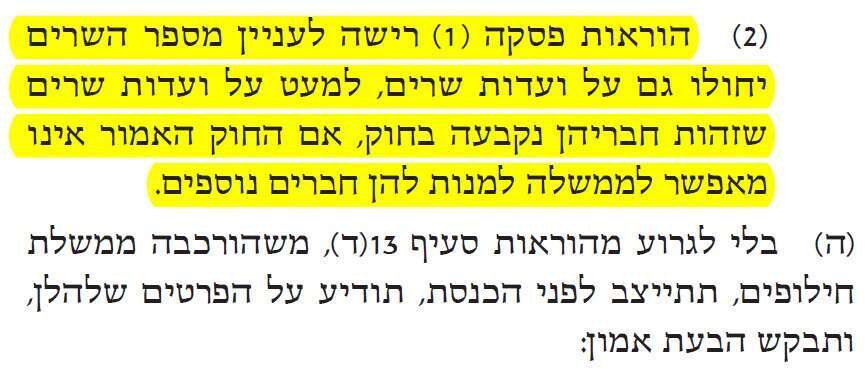 אם יתממש התרחיש של הקמת ממשלת בנט־לפיד, מפלגת ימינה – בתור הצד החלש יותר בנישואין הללו – עשויה לרצות בהארכת תוקפם של סעיפי החוק. גם אם בממשלה יוענק לה כוח פריטטי, היא עדיין תזדקק להגנות בכנסת מפני בגידה של מפלגה אחרת. אלא שכדי להחיות את הוראות השעה המעניקות ביטוח כזה, היא תזדקק ל־61 אצבעות. בממשלת מיעוט הנשענת על תמיכה מבחוץ של הסיעות הערביות, היא תתקשה להשיג את הרוב הדרוש. הסעיפים האמורים מחלישים את כוחה של הכנסת ומקשים עליה להפיל את הממשלה; לסיעות שאינן שותפות ישירות לשלטון אין שום סיבה לתמוך בהצעה כזו. "גם אם בנט מכהן ראשון כראש הממשלה, הוא יכול לנסות לפרק את הממשלה לאחר כמה חודשים", מסייג פוקס. "ממשלה לא יכולה לשרוד כאשר יש רוב בכנסת שלא רוצה אותה. אתה רוצה ממשלה מתפקדת? תגיע להסכמות עם הצד השני. ההתעסקות עם הסעיפים האלו לא תעזור. מה שנחוץ הוא אמון. במערכת שבה כל אחד מבקש לפגוע באחר, לא יעזרו חוקים והגנות".