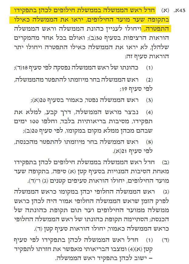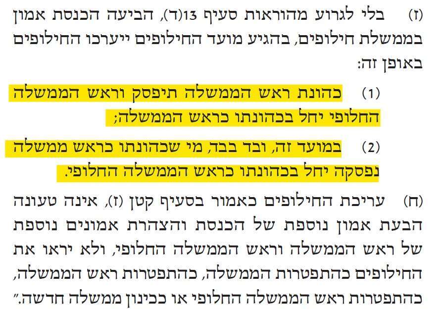 על פי "חוק יסוד: הממשלה", התפטרות ראש הממשלה פירושה התפטרות הממשלה כולה, והיא מובילה בהכרח לפתיחת הליכים לכינון ממשלה חדשה – עם בחירות או בלעדיהן, בהתאם לנסיבות. אבל החוק החדש קובע כי בממשלת החילופים ראש הממשלה וראש הממשלה החליפי יתחלפו בתפקידיהם באופן אוטומטי בתאריך שנקבע מראש – במקרה הזה, נובמבר 2021 – אך הממשלה עצמה תמשיך בתפקידה. זהו מודל רוטציה שאינו תלוי ברצונו הטוב של ראש הממשלה המכהן. בין שירצה בכך ובין שלא, כהונתו פוקעת כעבור פרק זמן קצוב.