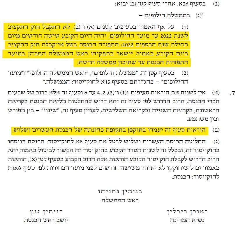 החוק מדבר על תקציב 2022, שהיה אמור להגיע לאישור הכנסת בעת כהונתו של גנץ כראש ממשלה: אם הכנסת לא תעביר את התקציב הזה במועדו, כך נקבע, היא תפוזר - אך ראש הממשלה ימשיך לכהן עד להשבעת ממשלה חדשה. הדבר נועד להגן על גנץ מפני נפילה מוקדמת של הממשלה בעת שהוא עומד בראשה. בפועל, הכנסת ה־23 אפילו לא התקרבה לשלב הזה של חייה.