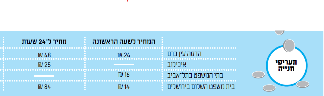 במכרזים הישנים של משרד האוצר מצאתי שחניה של ארבע שעות בבתי המשפט בחיפה אמורה לעלות לי כ־27 שקלים, ובבאר־שבע 25 שקלים. בראשון־לציון שילמתי הרבה יותר, וזאת משום שמפעילת החניה שם היא חברה פרטית שנחשבת לספק יחיד, ולכן קל לה יותר לדרוש מחיר גבוה. בתל־אביב החניונים שייכים ל"אחוזות החוף", חברה בבעלות עיריית תל־אביב, ושם בין שבע בבוקר לארבע אחר הצהריים נשלם 16 שקלים לכל שעת חניה.