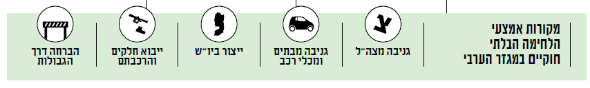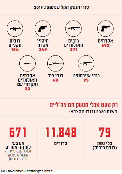 הגבולות הם רק מקור אספקה אחד לנשק בלתי חוקי. רובים ואקדחים נגנבים בכל שנה מבסיסי צה"ל ומאזרחים, לצד תחמושת וחומרי נפץ. כלי נשק אחרים נוצרים מאפס, או כמעט מאפס, במחרטות בישראל ובעיקר ביו"ש. כל אלה יחד עומדים מאחורי ההתחמשות הגוברת של המגזר הערבי. לרשויות החוק הישראליות אין מענה, ותוצאות המחדל ניכרות לעין: יותר ממאה אזרחים ערבים נרצחו בנסיבות פליליות מאז תחילת 2021, ואירועי ירי – בחגיגות וחתונות, בפשיעה פשוטה או מאורגנת, ובמה שמכונה "סכסוכי חמולות" – הפכו לאיום של ממש על חיי העוברים והשבים ברחובות הערים הערביות והמעורבות.