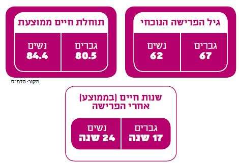 לנשים יש יותר שנות פנסיה באופן מובהק: הן חיות יותר מגברים, אבל יוצאות לפנסיה חמש שנים לפניהם. נכון לשנת 2021, תוחלת החיים הממוצעת של גברים בישראל היא 80.5, לעומת 84.4 אצל נשים – פער של כארבע שנים. בארבעים השנים האחרונות, תוחלת החיים של נשים שהגיעו לגיל 65 עלתה בשש שנים, מ־80 ל־86, ואילו של גברים שהגיעו לגיל 65 – בחמש שנים, מ־79 ל־84. לפי גיל הפרישה הנוכחי, גברים צפויים לחיות בממוצע 17 שנים אחרי פרישתם ונשים 24 שנים, כלומר פער של שבע שנים.