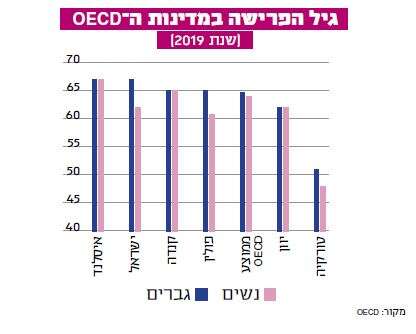 ישראל הייתה אחת המדינות הראשונות בעולם המפותח שעשתה את הצעד הזה, אבל מאז התמהמהה בביצוע הצעד המשלים: העלאת גיל הפרישה לנשים לגיל 67, כפי שהייתה אמורה לעשות. החוק הראשוני קבע כי גיל הפרישה לנשים יעלה בשלוש פעימות: ל־62, ואז ל־64, ולבסוף יושווה לגיל הפרישה של גברים. אבל בפועל גיל הפרישה עלה ל־62, והפעימה השנייה לא בוצעה מעולם. בשבוע שעבר אישרה הכנסת סוף־סוף את העלאת גיל הפרישה לנשים. היא צפויה לחול מינואר 2022, בתהליך מדורג שיימשך 11 שנים ויעלה את גיל הפרישה ל־65.