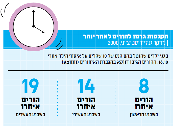 ד"ר תמי הראל־בן־שחר מהפקולטה למשפטים באוניברסיטת חיפה, מומחית לדיני חינוך, מזכירה לנו שני מחקרים מעניינים שנערכו בנושא. בשנת 2000, חוקרי הכלכלה ההתנהגותית פרופ' אורי גניזי ופרופ' אלדו רוסטיצ'יני בדקו מה קורה בעקבות הטלת קנס קטן על איחורי ההורים – האם יותר הורים מאחרים, או פחות? הניסוי שלהם הוכיח שהטלת הקנס גרמה לכך שההורים ראו בתשלום הנוסף היתר לאחר. רבים מהם היו מוכנים לשלם עשרה שקלים ולאסוף את הילד באיחור, ולא הורתעו מהקנס אלא ראו בו מעין תשלום בייביסיטר.
