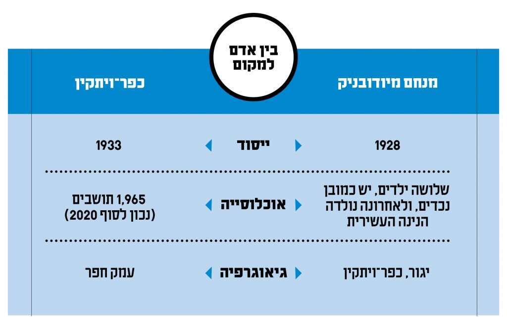 על קיר הבית נתלה שלט: "בית חוה ושלמה מיודובניק. נבנה ב־1933 כאחד מארבעת הבתים הראשונים בכפר־ויתקין. יציקת בטון בת שני חדרים בלבד. ב־1945 נבנתה קומה שנייה לבן ממשיך ומשפחתו. ב־1976 נבנה בצמוד האגף הצפוני לנכד ומשפחתו". "שאנשים לא יגידו: 'תראו את המושבניקים, איזה וילות יש להם'", מסביר מנחם את פירוט היתר