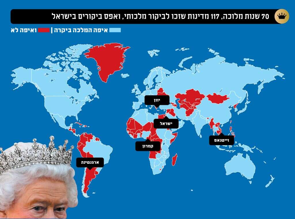 ארץ ישראל לא יצאה מגדרה לחגוג את חתונתה, ואליזבת מצידה לא יצאה מגדרה לחגוג את ארץ ישראל. עד יום מותה בשבוע שעבר לא שזפו עיניה של מלכת אנגליה את מראות הבנייה הציונית ומדינת ישראל המתפתחת. "אנחנו לא באמת יודעים מה הייתה גישתה של המלכה לישראל, שכן היא מעולם לא התבטאה בעניין", אומר מארק רגב, שגריר ישראל בבריטניה עד לפני כשנתיים, וכיום ראש מכון אבא אבן לדיפלומטיה בינלאומית באוניברסיטת רייכמן. "היא ביקרה ב־117 מדינות, ובהן גם מדינות מזרח־תיכוניות, מדינות ערביות, מדינות במפרץ, אבל אף פעם לא בישראל. היא פשוט לא הגיעה לפה כמלכה".