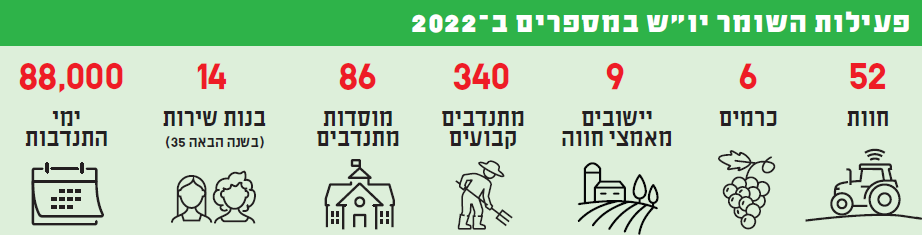 הארגון צומח במקביל לצמיחת החקלאות היהודית: לפני כעשור, אומר סויסה, פעלו תשע חוות חקלאיות בכל יו"ש, והיום פועלות 75. השומר יו"ש תומך ב־52 מהן, ומערך המתנדבים צומח בלי הרף: ב־2021 היו 270 מתנדבים קבועים, ב־2022 יש 340, וההערכה היא שב־2023 יהיו 450. ב־2022 תיעד הארגון 88 אלף ימי התנדבות, וב־2023 הוא מצפה ל־130 אלף. הארגון גם מסתייע בהתנדבות של מוסדות לימוד, כמו מכינות או סניפי בני עקיבא: ב־2021 השתתפו בפעילות השומר יו"ש 36 מוסדות, ב־2022 השתתפו 86 מוסדות, ולקראת השנה הבאה מקווה הארגון לעבוד עם יותר ממאה. מליחי מספרת שזו השנה השלישית שהשומר יו"ש זוכה להשתמש בתקני שירות לאומי רשמיים של המשרד לביטחון פנים. "התחלנו בקטן וגדלנו בשנתיים האחרונות", היא אומרת. "גם הביקוש מצד הבנות גדל. התפקיד שלהן מתרכז בחינוך ובשמירה על אדמות הלאום. הן לא באות להחליף עובדים אלא להיות כוח עזר בחוות. 35 התקנים שנקבל ב־2023 לא מספיקים לנו, הלוואי שנגדל".