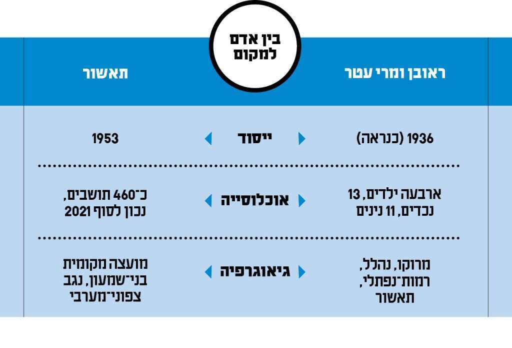 האופי של תאשור, מספרים בני הזוג, השתנה מאוד לאורך השנים. "פעם הייתה פה חברות, מסיבות, ערבות הדדית. היום הכול נדל"ן ואיכות חיים", אומר ראובן. "זה לא מה שהיה. הרבה עזבו או החזירו ציוד. אפשר לספור על כף היד כמה מהראשונים נשארו". קחו למשל את אווירת המימונה. הם בהחלט מרוצים מהמועצה, שמארגנת חגיגות "עם מוזיקה והכול", הבית של הזוג עטר עדיין פתוח לכולם "עם מופלטות, שולחן ערוך וכל מה שאפשר", והמשפחה כולה באה וחוגגת - "אבל פעם במימונה היו עוברים כאן ביישוב בית־בית. עכשיו גם זה נגמר".