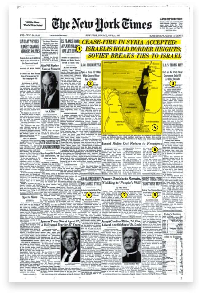 העיסוק במזרח התיכון ביום שאחרי המלחמה תפס חלק ניכר מהעיתון, גם אם לא את כולו. מלבד זאת תוכלו למצוא בשער גם ידיעות על ענייני הממשל האמריקני (תקציב ומיסים, התפטרויות ומינויים), הלחימה בווייטנאם, תוכניות לטיפול באלימות ב"גטאות" השחורים בעיר ניו־יורק, הספדים לכוכב ההוליוודי ספנסר טרייסי ולארכיבישוף הליברלי של סנט־לואיס, עדכוני בייסבול ומרוצי סוסים, וגם הודעה לקוראים: מחיר העיתון יעלה ל־40 עד 60 סנט, תלוי באזור החלוקה.