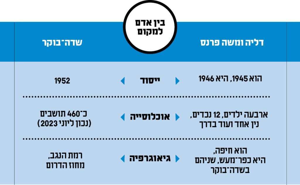 הגרעין שלהם היה מיועד לקיבוץ בחן של יוצאי דרום אמריקה, "אבל כנראה היינו קצת גזענים, ובעיקר חיפשנו להגשים את החלוציות באזור מבודד ורחוק מהמרכז". זו שעל המקלדת פוצחת בסדרת שיעולים במבטא ארגנטינאי, ופרנס מתנצל בחיוך. כך או כך, הגרעין הועבר אחר כבוד לשדה־בוקר. "היינו שמונים חברים מהגרעין, נותרנו ארבעה, כולם חיפאים". מה היה בשדה־בוקר כשהגיעו הנה ב־65'? מעט מאוד אנשים וראש ממשלה אחד. והייתה גם דליה.