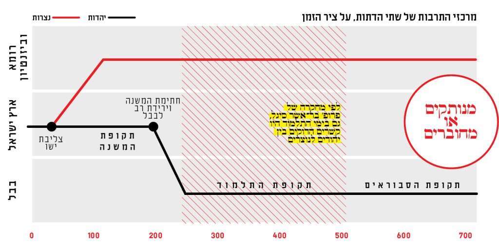 "יש השערות שונות בזיהוי הרגע הזה של הפרדה. למשל, חיפוש הפעם הראשונה שבמקור נוצרי מופיעה הנצרות כמונח - ישו הרי לא נקרא 'נוצרי' בברית החדשה - או חיפוש המקור הכי מוקדם ללעג של הנוצרים כלפי היהודים. הבעיה בפרדיגמה הזאת היא שזה לא עובד עם מה שיש לנו בשטח. קודם כול, באיזו יהדות מדובר? הפער בין היהדות המקראית לזו של אחרי החורבן הוא עצום. התנ"ך נגמר בדניאל, תחילת בית שני, ואז יש 'חור' בימי בית שני עד המשנה. הנצרות היא המשך של היהדות המקראית או החז"לית? יתרה מכך, כל מה שאנחנו יודעים על היהדויות של בית שני, כלומר הכיתות השונות, לא מצביע על יהדות אחת. אז המודל הזה פשטני.