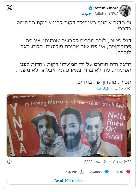 אבל ליברפול האגדית, שבארץ כמות האוהדים שלה אדירה, יישרה קו באופן מאכזב עם הגישה של ראשי הליגה האנגלית. השיא היה כשהמועדון החרים מקבוצת אוהדים ישראלית ביציע דגל, ללא כל סממן פוליטי, שביקשו להנציח בו ארבעה מאוהדי הקבוצה שנרצחו בפיגוע הטרור. "אני לא אדם שנוהג לערב פוליטיקה וספורט אבל במקרה הזה הגבתי אחרת לחלוטין, כי ברגע שקלטתי עד כמה המועדון הזה אנטישמי ובעיקר צבוע, ולא מסוגל להראות אפילו טיפה של אמפתיה כלפי מה שעובר עלינו, בשנייה משהו התנפץ אצלי ונכבה לתמיד", מספר בן־גל, "ההרגשה היא שקיבלתי סטירה מהארגון שאני הכי אוהב ומעריץ כל כך הרבה שנים. ליברפול באופן מסורתי זה מועדון שמביע תמיכה בנפגעי אסונות שהיו אוהדי הקבוצה או בפעילות למען זכויות אדם, כמו התמיכה לפני מספר שנים בתנועת "חיי שחורים נחשבים" לאחר הרצח של ג'ורג' פלויד בידי שוטר אמריקני, תמיכה שחלק ממנה הייתה כריעת ברך של כל השחקנים לפני שריקת הפתיחה של משחקים באותה תקופה. אחרי שראיתי את ההתנהלות במקרה שלנו, מיד הבנתי שהסיפור עבורי כאן נגמר, מחקתי את העמודים במדיה החברתית, לא צפיתי באף משחק מאז והאמת שזה לא מפריע לי בכלל. לפחות עכשיו התפנו לי סופי השבוע להיות יותר עם הילדים, לקרוא ספרים או לראות סרטים".