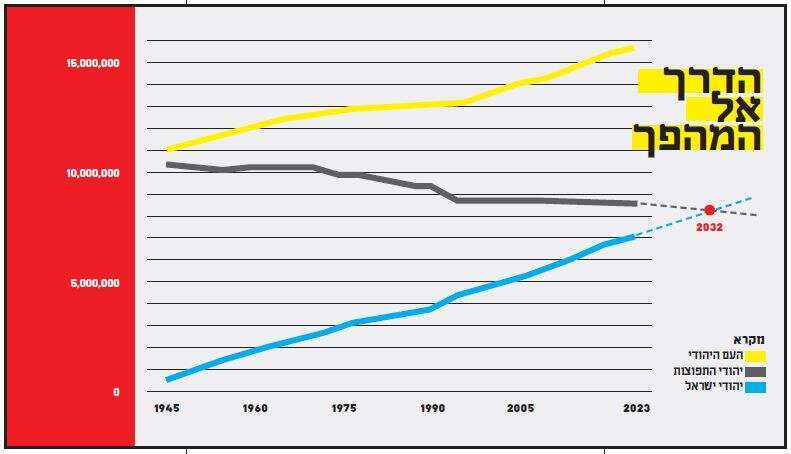 הקהילות היהודיות האחרות בעולם, לעומת זאת, נמצאות כמעט כולן במצב של "פוחת והולך". מספר יהודי התפוצות בתחילת 2023 היה 8,589,800, שהם 54.7 אחוז מכלל יהודי העולם. זאת התכווצות של 18 אלף נפש בתוך שנה. רק בזכות הצמיחה הדמוגרפית כאן בארץ נרשמה בשורה התחתונה צמיחה של 100,800 נפש באוכלוסיית היהודים בעולם. ישראלית יהודייה ממוצעת של שנת 2022, אומר דלה־פרגולה, תלד במהלך חייה פי שניים ויותר מהאישה היהודייה ברוב מוחלט של הקהילות בתפוצות. מה שמוביל לדרמה דמוגרפית נוספת, שתתרחש גם היא בתחילת העשור הבא: "לפי אומדן זמני מ־1 בינואר 2024, חיים כיום בעולם 15.8 מיליון יהודים. זה כ־700 אלף פחות ממספר היהודים ערב השואה. המשמעות היא שבתוך שבע שנים בערך נוכל לסגור את הפער. שני ציוני הדרך הללו עשויים להתרחש כמעט במקביל – כאמור, אם ריבוי יהודי ישראל ימשיך בקצב הנוכחי, וזה כמובן לא מובטח".