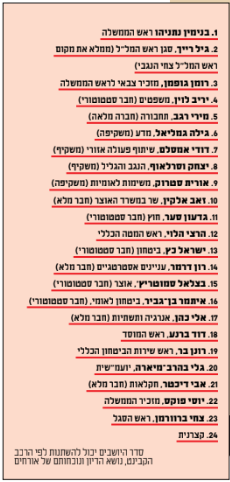 הבכיר מודה שעומס השרים בקבינט מקשה על יעילות התדרוך, אבל טוען שגם לצה"ל יש אחריות לכך. "גופי הביטחון עושים כרצונם", הוא מלין. "לאחרונה התכנס הקבינט בפיקוד המרכז, והסקירה הביטחונית לא כללה דבר מלבד מצגות. מי שמשפיעים על ההחלטות הביטחוניות של ראש הממשלה הם לא חברי הקבינט, אלא המזכיר הצבאי גופמן, מקורבו השר דרמר שמשמש כשליחו של נתניהו לאמריקנים, דרעי שזוכה לאמון רב מנתניהו, שר הביטחון כ"ץ וגם, במידה מעטה יותר, סמוטריץ' ולוין. השרים מקבלים עדכונים ביטחוניים, אבל אינם מעורים מספיק. אפשר להתווכח בגלל מי, אבל בשורה התחתונה מנהלי המדינה לא יודעים מה קורה מאחורי הקלעים, והקבינט הוא חותמת גומי".