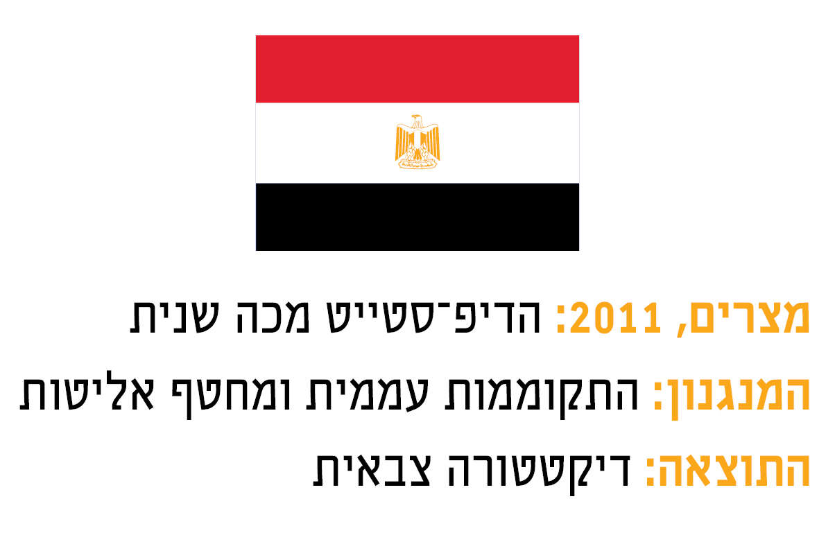 הגנרלים המצרים – "דיפ־סטייט" במובן המובהק ביותר של המונח – לא נבהלו, אלא נסוגו והמתינו שהאבק ישקע. הם אפשרו לאחים המוסלמים לעשות טעות אחר טעות, לדחות את תמיכת הציבור ולהרוס את הכלכלה. למעשה הם המתינו עד שאותם המונים חילונים שהדיחו את מובארכ יתחננו לצבא שיציל אותם כעת ממורסי. בקיץ 2013, הצבא השיב את הטנקים לרחובות. גנרל עבד אל־פתאח א־סיסי פירק באלימות את האחים המוסלמים והקים מחדש את המשטר הסמכותני.