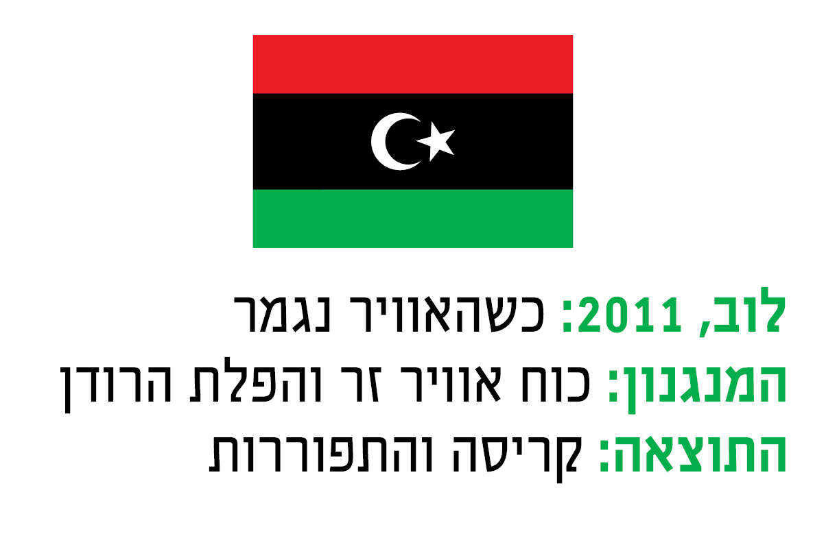 מי שמבקש לראות מה קורה כאשר מדיחים משטר בלי מאמץ רציני לבנות מחליף במקומו, צריך לפנות ממצרים אל אחת משכנותיה ממערב. בראשית אביב 2011 פרץ מרד חמוש נגד מועמר קדאפי, הרודן המוזר והאכזר ששלט במדינה באופן מוחלט במשך 42 שנה. בזמן שטורי השריון הארוכים של קדאפי יצאו לדכא את כוחות המורדים בבנגאזי, הדיקטטור שידר נאום לאומה ובו הבטיח לצוד את המורדים "סמטה אחר סמטה", ולהשמיד את כולם כמו חולדות.